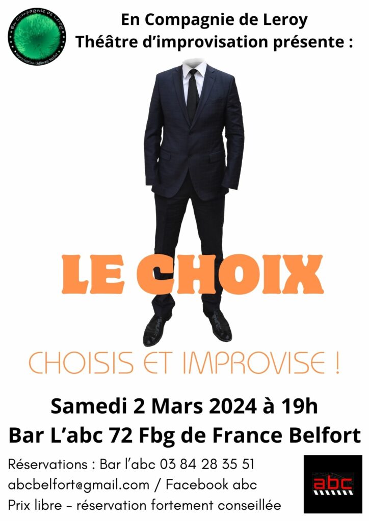 Le choix : choisis et improvise ! Dans ce cabaret, samedi 2 mars à 19h à l’abc, les comédiens et comédiennes auront le choix des contraintes à tenir sur scène… à moins que la malicieuse MC (maîtresse de cérémonie) n’en décide autrement.