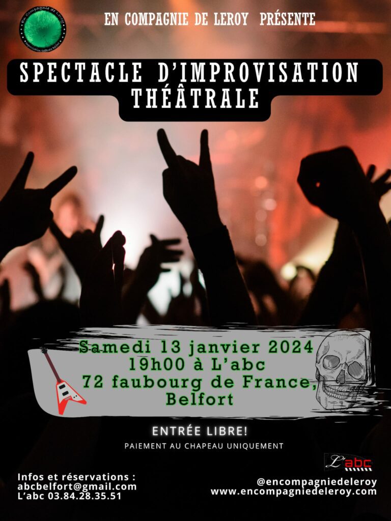 Les comédiennes et comédiens d’En Compagnie de Leroy vous proposent un cabaret d’improvisation qui sentira bon les cheveux longs et les solos de guitare électriques : des scènes toujours improvisées sur les thèmes que vous donnez, des catégories classiques imposées, tout cela dans une ambiance métal !