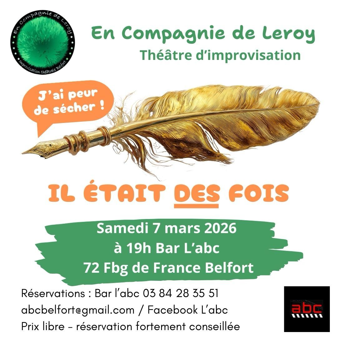 Il était une fois, la compagnie d’improvisation En compagnie de Leroy qui s’apprêtait à présenter un nouveau cabaret. Un cabaret « Il était des fois », où il est question de visiter la première, mais aussi la deuxième, troisième, millième ou dernière fois qu’une histoire se produit. Par contre, comme pour tout spectacle d’improvisation, le cabaret en lui-même ne se jouera qu’une seule fois, et ce sera le 7 mars à 19h à l’abc !