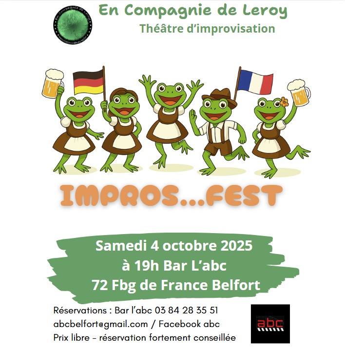 Fatigués de la rentrée ? Les vacances vous manquent déjà ? La compagnie En compagnie de Leroy vous propose un cabaret Impros…Fest à l’abc le samedi 4 octobre 2025, de 19h à 21h. Fuyez la pluie et la morosité, et venez vous amusez avec nous.