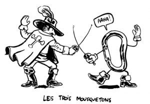 C’est la crise : réduction d’effectif ! Les 3 Mousquetons (ne) sont (que) deux comédiens et un improvisateur sonore. Prise de risque à tous les étages pour ce collectif issu d’En Compagnie de Leroy. Ils se produiront pour la première fois au festival ! (Crédit dessin : Klub et Diantre)