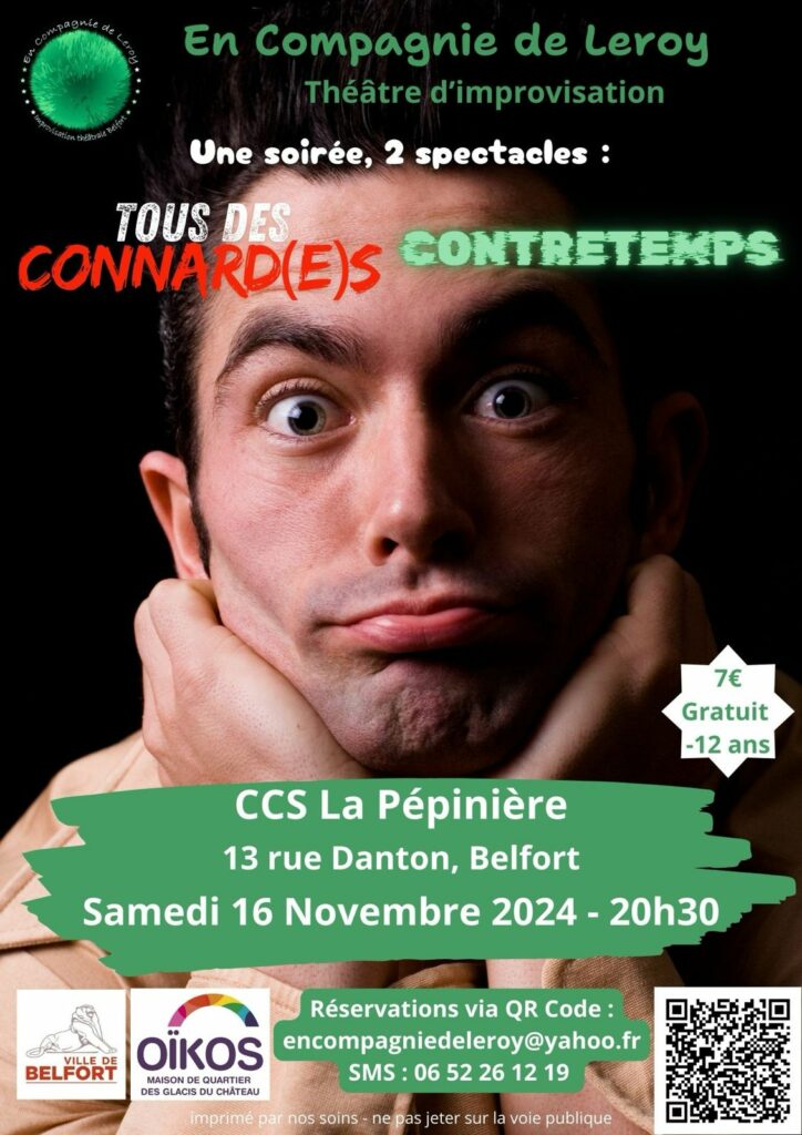Voici venue l’heure du premier gros spectacle de la saison 2024-2025 ! Nous vous invitons le 16 novembre, à 20h30 au Centre Culturel et Social de la Pépinière. Là, vous pourrez profiter non pas d’un, mais de deux spectacles d’improvisation contemporains : Tous des connard(e)s (création de Sébastien Chambres), et Contretemps. Ce spectacle se fera conjointement avec 3 membres de la troupe des Impropotams.