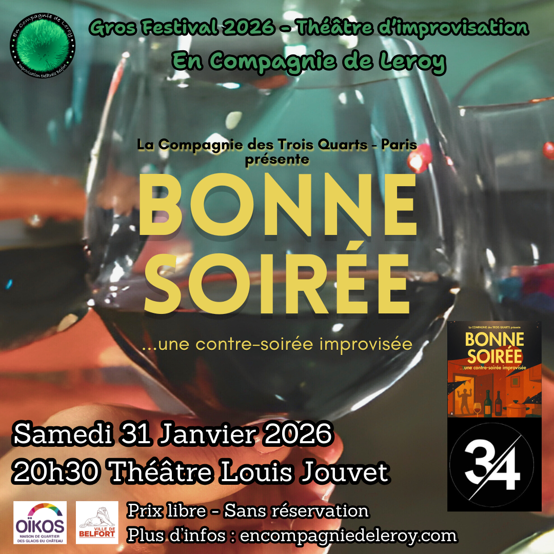 20h30 : Bonne soirée : Vaudeville – Les Trois-Quarts vous donnent rendez-vous dans la cuisine d’une soirée choisie par le public. On y découvre secrets, confidences, annonces, surprises et commérages… Une pièce de théâtre entièrement improvisée où les relations naissent et se transforment au gré des rebondissements.