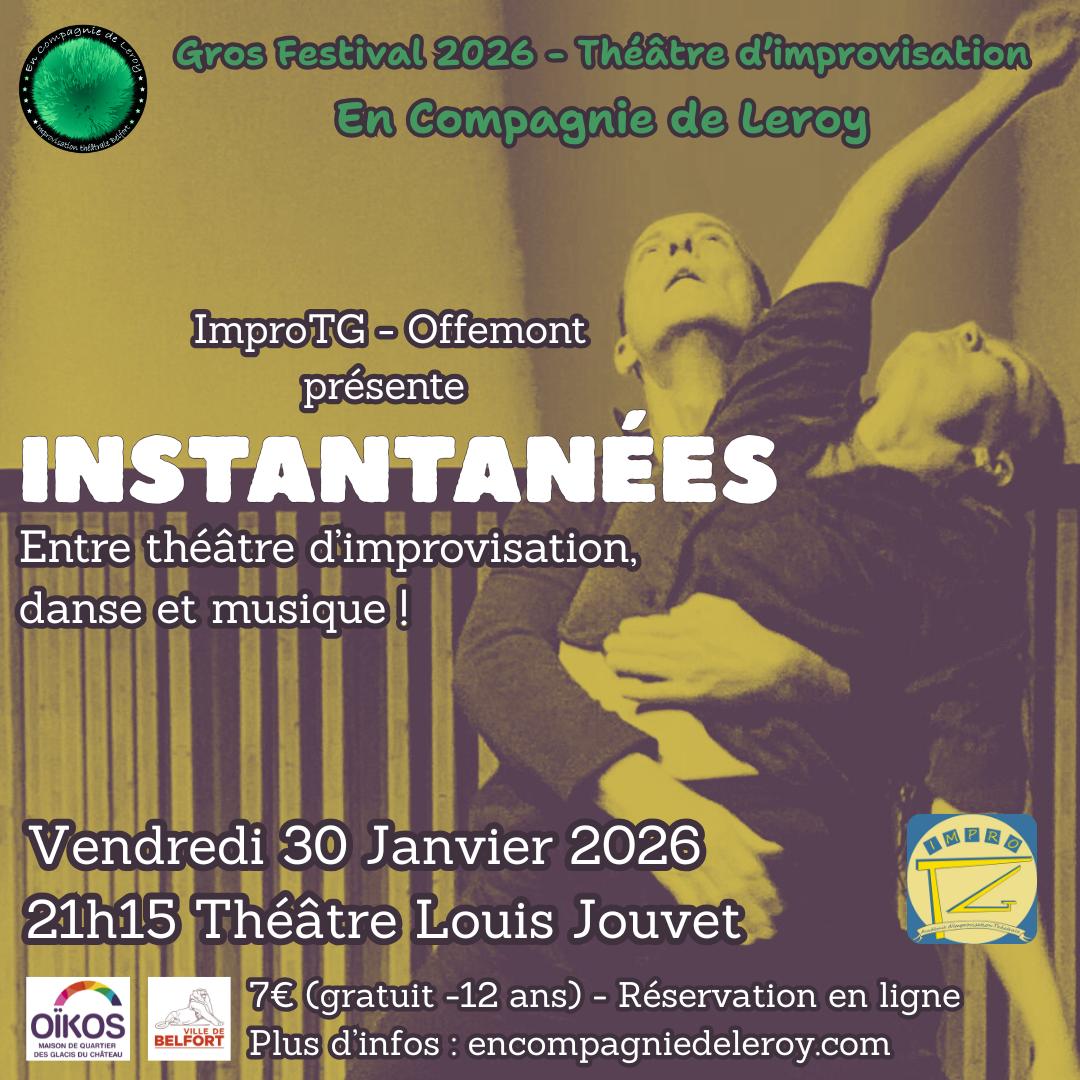 21h00 : Instantanées – Un spectacle où se rencontrent l’improvisation théâtrale, la danse, et la musique live. Les histoires émergent de la rencontre entre les trois arts.