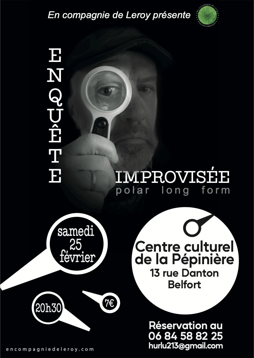 Venez assister à une enquête exclusive et totalement improvisée d’un (vieux) détective qui arrivera (peut être) à trouver le coupable parmi les comédiens de Leroy et leurs invités… tous suspects évidemment !