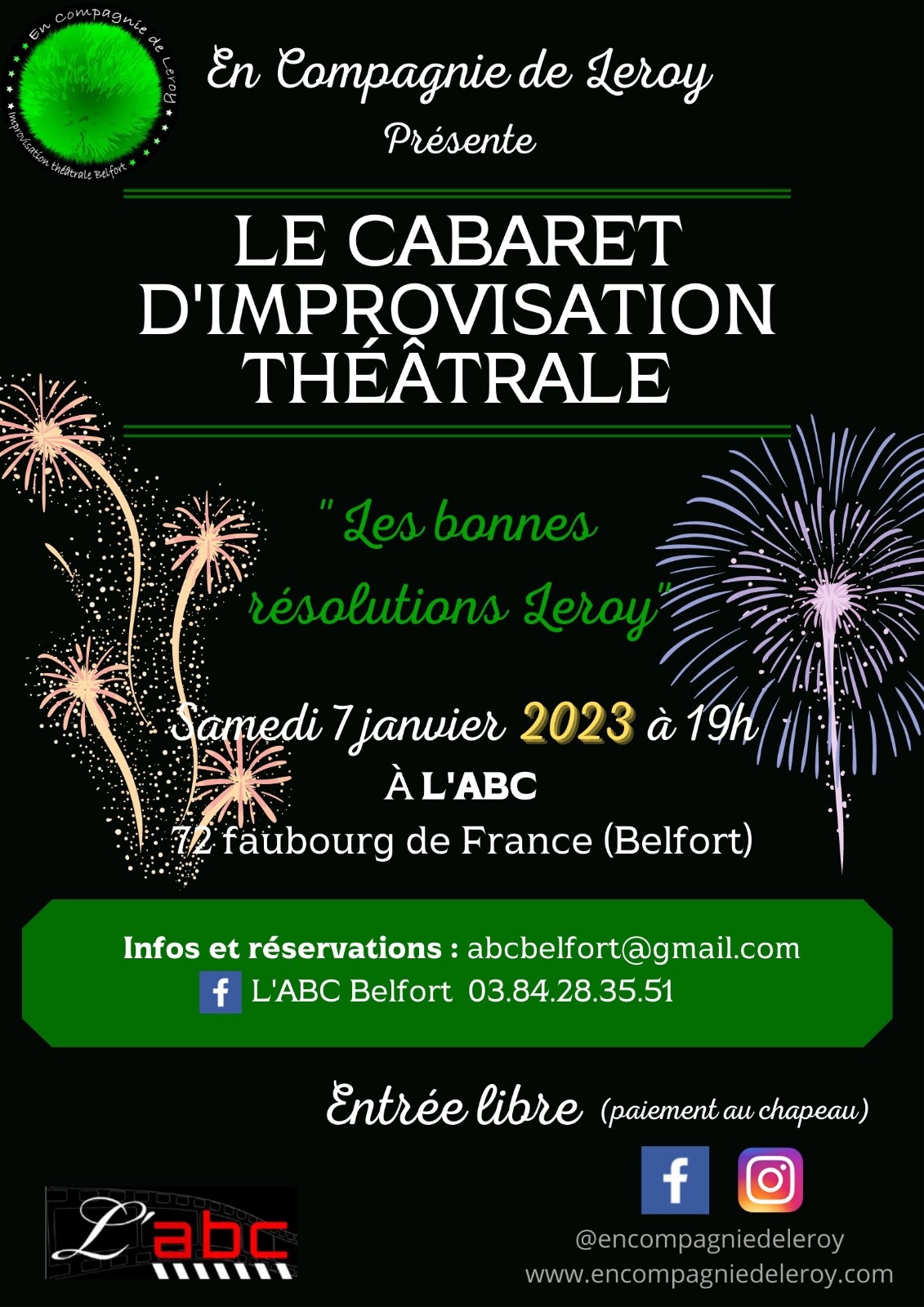 Comme tous les ans, vous avez sûrement pris une liste interminable de bonnes résolutions, très créatives, sérieuses, éthiques et ambitieuses, que vous ne tiendrez pas, comme tous les ans. Il en est de même pour nous, membres d’En Compagnie de Leroy. Pour savoir lesquelles et rigoler un coup, venez nous voir dans notre premier spectacle de l’année 2023, le samedi 7 janvier à 19h à l’ABC !
